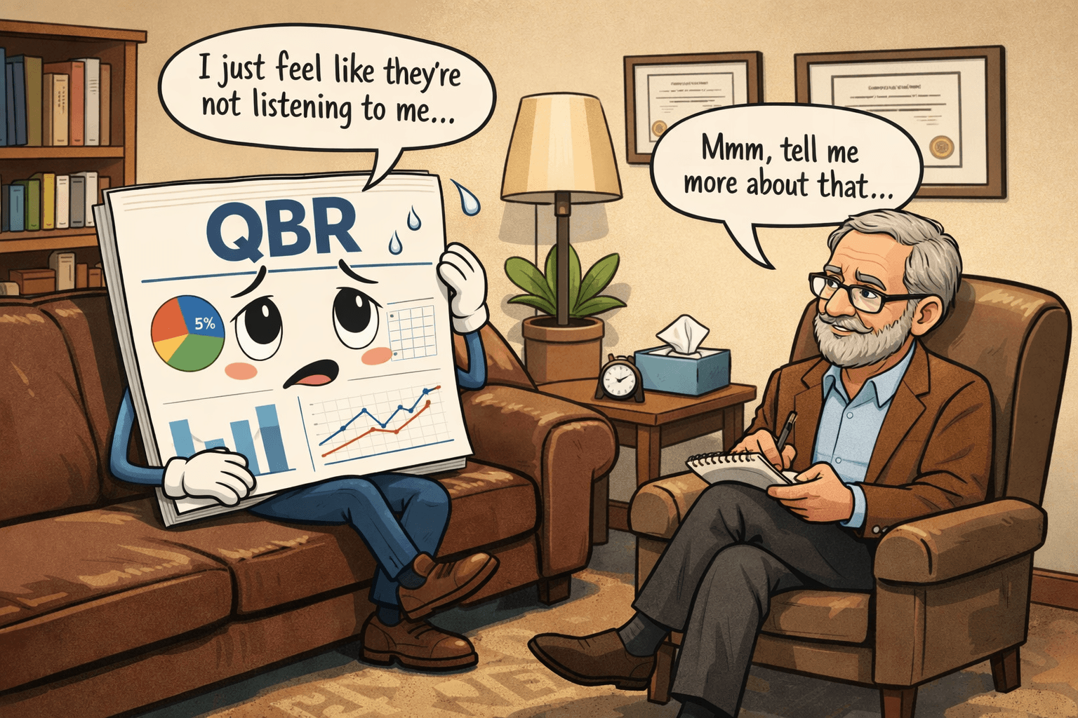 Quarterly Business Reviews were meant to drive alignment, strengthen partnerships, and shape the next phase of growth. But over time, many QBRs have turned into ritualistic meetings full of charts, rehearsed optimism, and scattered context. In this story, a tired QBR finally walks into therapy and begins unpacking what really went wrong. Part 1 of the QBR Therapy Series.
